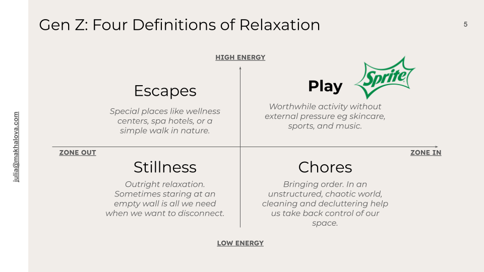 High energy + Zone-in: Play: Worthwhile activity without external pressure. The definition was very broad and included skincare, sports, and music.